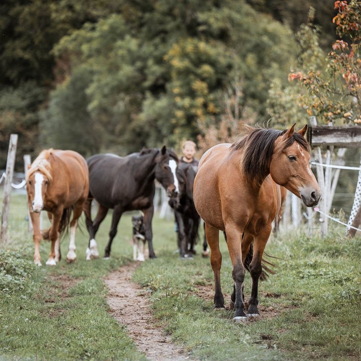 Offenstall mit viel Weidegang, 24h Raufutterzugang